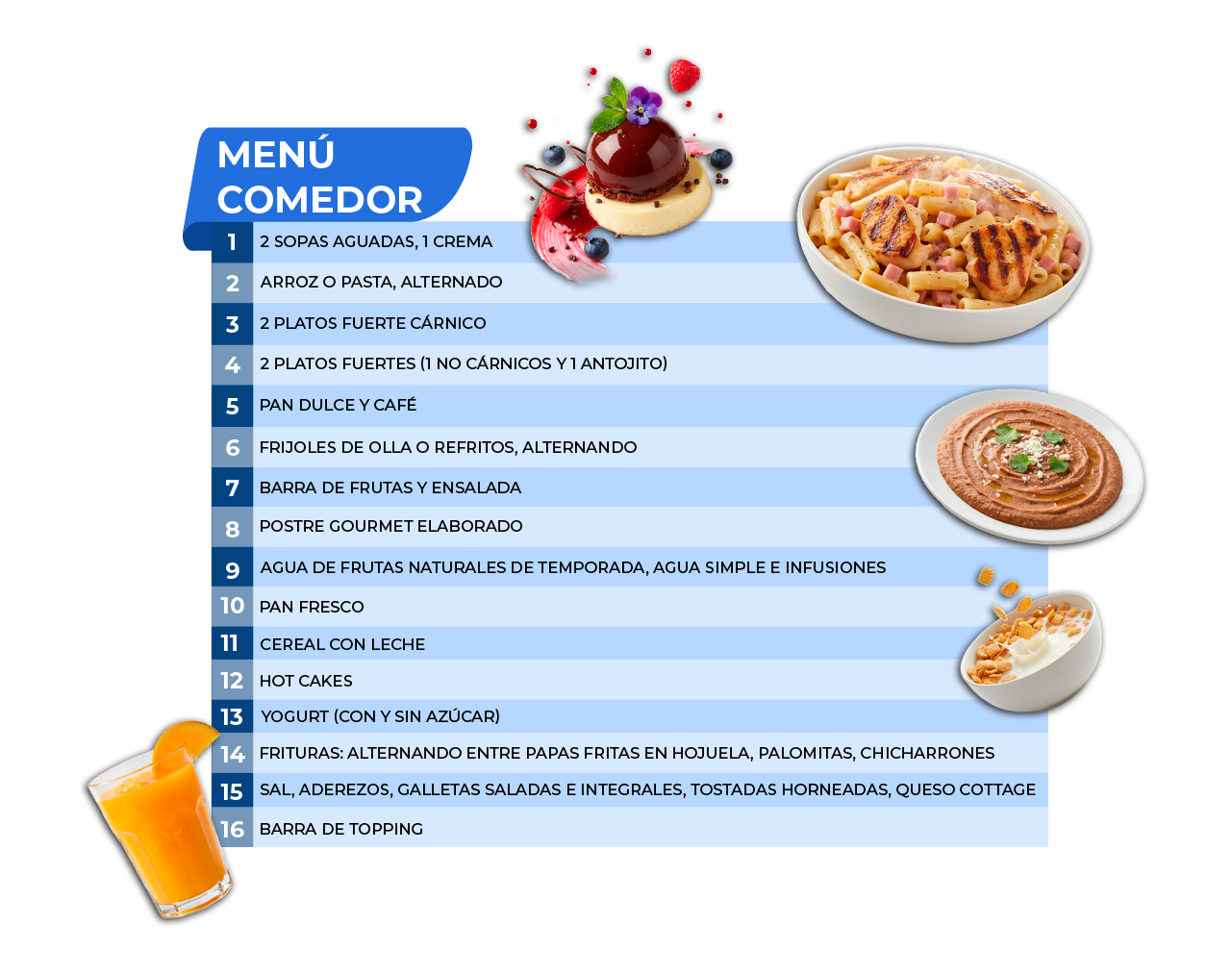 En "Alimento Certificado, Servicio de Comedor"  desarrollamos propuestas de menú equilibradas y adaptadas a las necesidades de cada operación. Consideramos el tipo de actividad, turnos de trabajo y requerimientos nutricionales para ofrecer platillos seguros, variados y con el aporte energético adecuado. Cada menú es planeado bajo criterios de calidad, higiene y control sanitario, garantizando una alimentación confiable que contribuye al bienestar y desempeño diario de tus colaboradores.